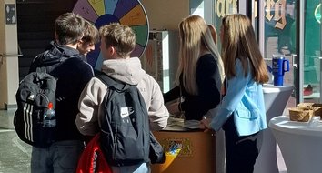 Das Glücksrad erwies sich als echter Besuchermagnet. Die Schülerinnen und Schüler stellten beim „Steuer-Quiz“ ihr Wissen (und Rateglück) unter Beweis und freuten sich über schnelle Brillen und Stofftaschen als Preise.